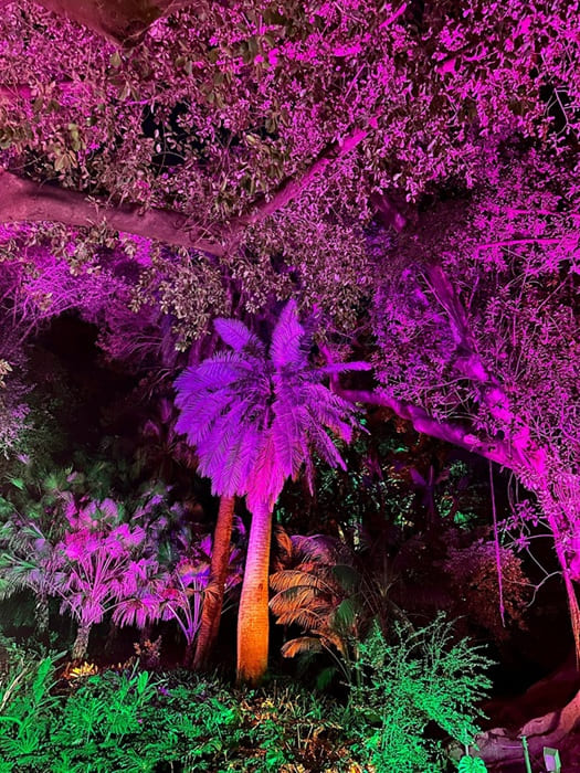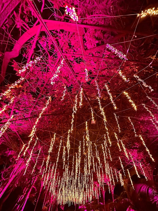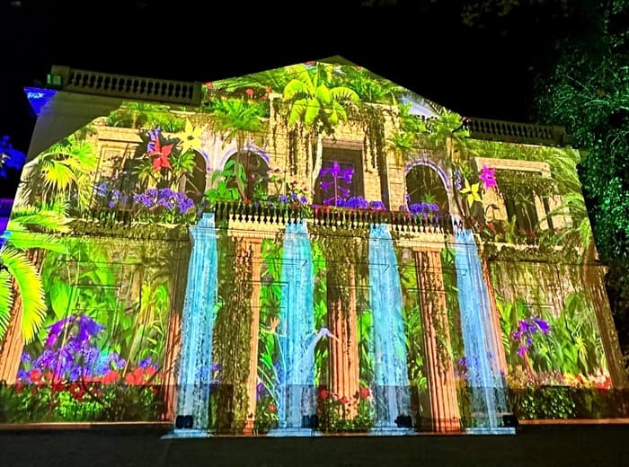 - Recorrido temático: Los visitantes siguen un camino de varios kilómetros a pie, donde millones de puntos de luz, esculturas luminosas y proyecciones de vídeo transforman el paisaje nocturno del jardín.